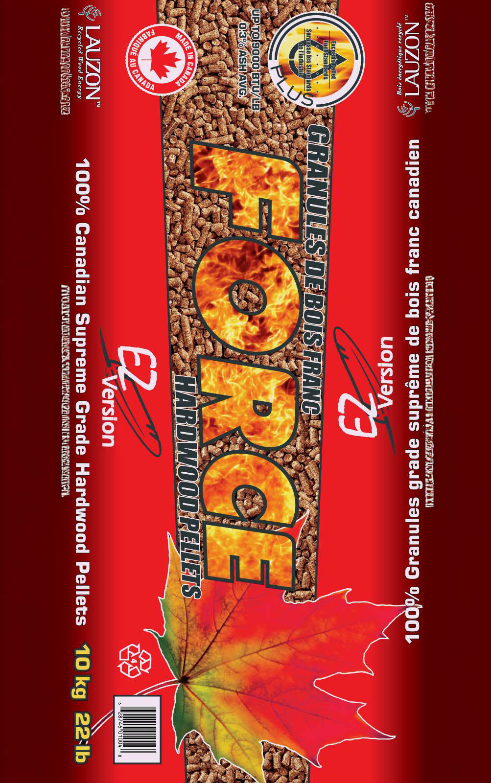 Lauzon FORCE is the same pellet as Northern Max, just produced in a smaller 22lb bag. Made from mainly KILN DRIED Oak hardwood, FORCE pellets generate 9000 BTU’s per pound with a very low 0.26% ash content.